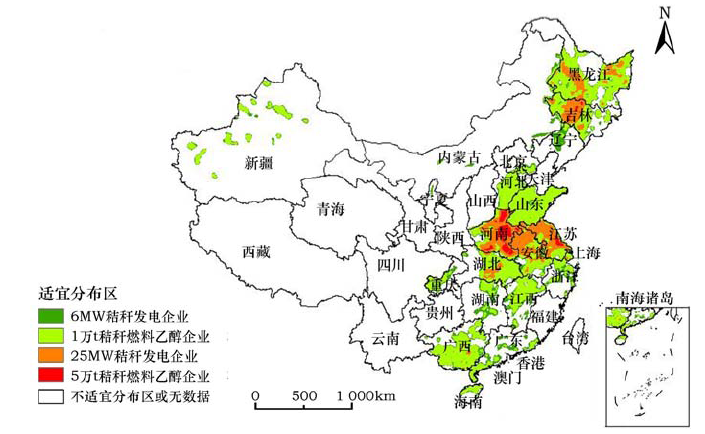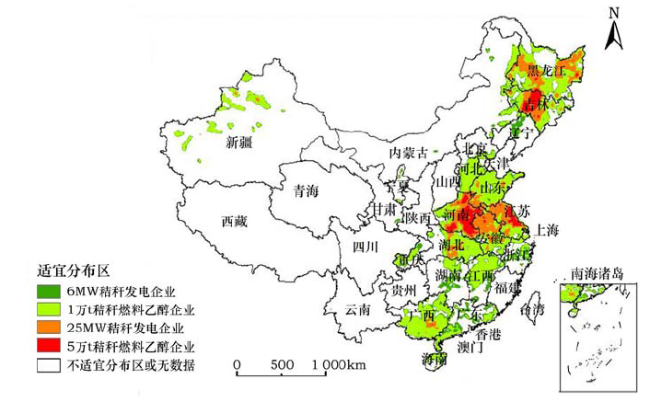 Figure 2 Suitability distributions of bioenergy plants with different scale in 2010图2 2010年不同规模秸秆能源企业分布 注:港、澳、台地区无数据。 |