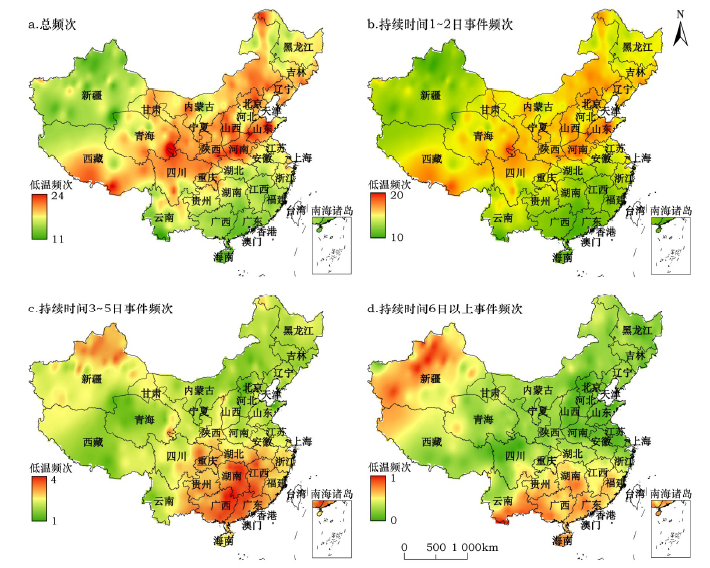 Figure 2 Spatial distribution of the frequency of single-site extreme minimum temperature events over China for the period from 1960 to 2014图2 1960-2014年气象站极端低温事件年均频次空间分布 |