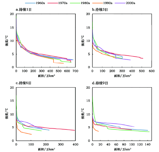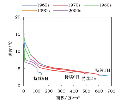 Figure 3 IAD envelope of the different durations (1d,3d,6d,9d)extreme minimum temperature events in different period from 1960 to 2014图3 各时间段内不同持续时间(1日、3日、6日、9日)极端低温事件IAD包络线 |