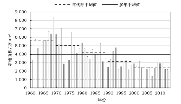 Figure 6 Annual cumulative farmland impacted by the extreme minimum temperature events from 1960 to 2014(based on the 2000 land use data;dotted line denotes the multi-year average)图6 1960-2014年极端低温事件累积影响的耕地面积(以2000年土地利用为基准,虚线为平均值) |
