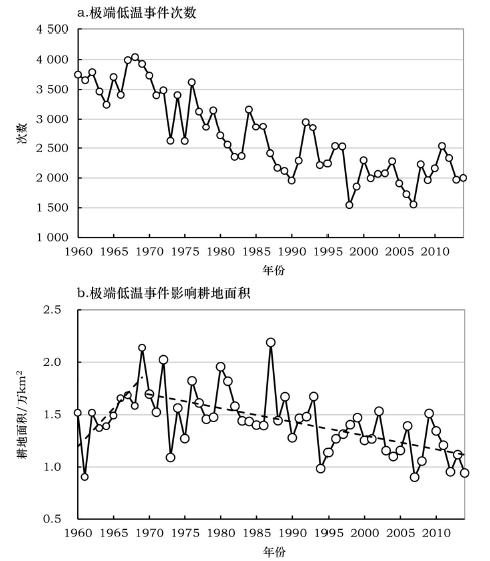 Figure 5 Frequency of extreme minimum temperature events from 1960 to 2014 and farmland area affected by the extreme minimum temperature events (based on the 2000 land use data)图5 1960-2014年极端低温事件的次数及极端低温事件影响的耕地面积(以2000年土地利用为基准) |