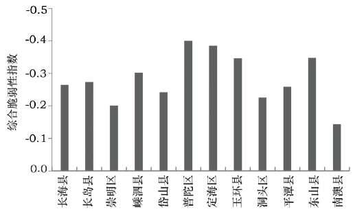 | 综合脆弱性 | 崇明区、南澳县 | 平潭县、岱山县、 洞头区 | 嵊泗县、长海县、长岛县 | 普陀区、定海区、东山县、玉环县 |