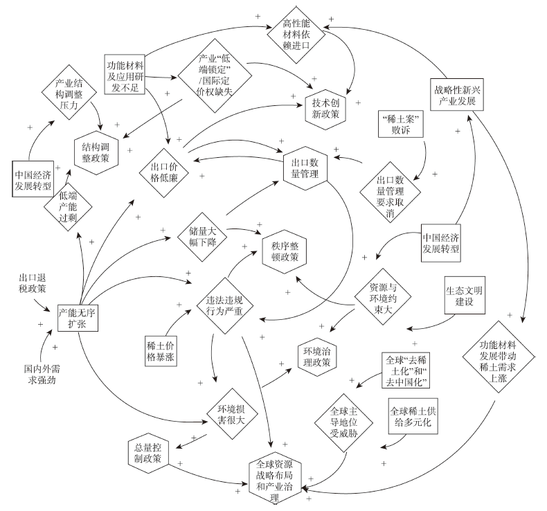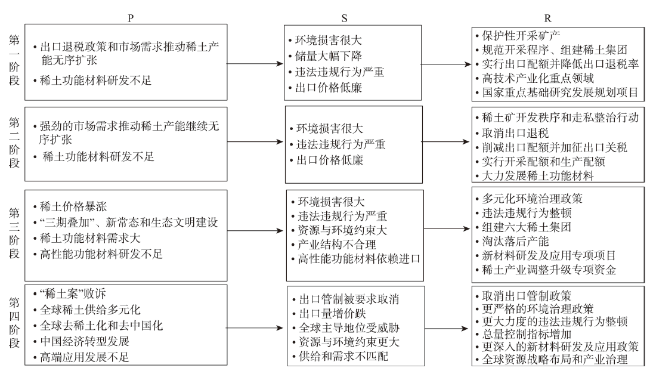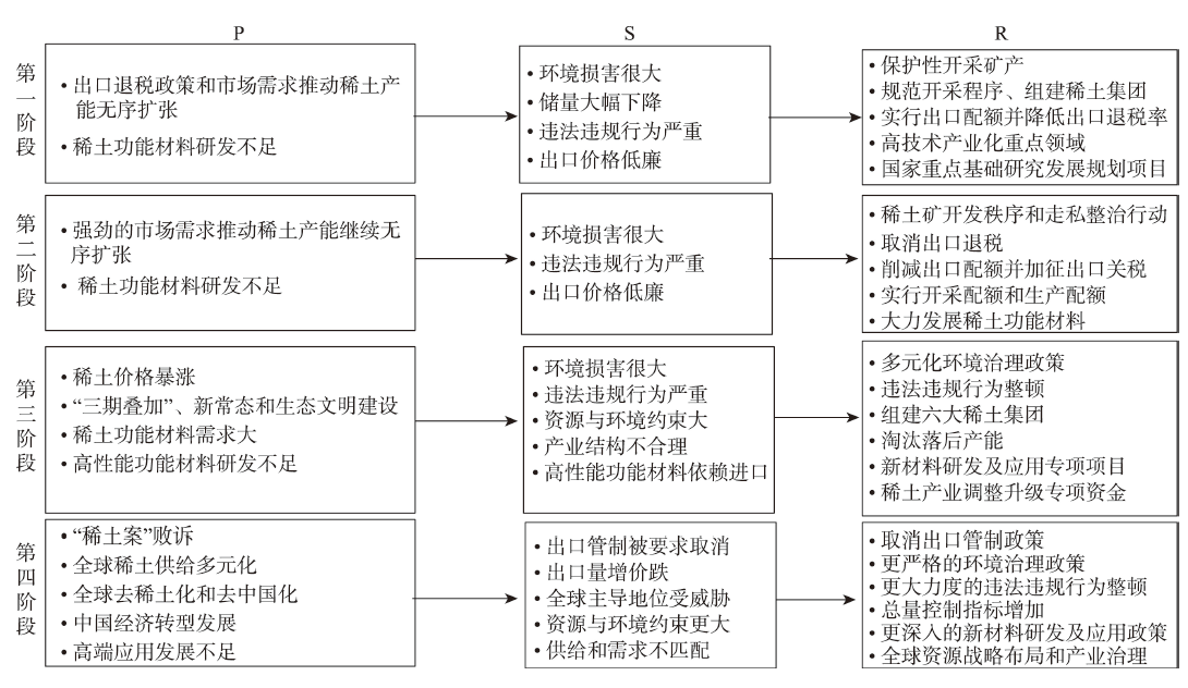 This study examined the evolution process of China’s rare earth policy, analyzed the drivers and mechanism of change, and identified the direction of future policy optimization and adjustment accordingly. Based on the key policies, China’s rare earth policy development can be divided into four stages: (1) encouraging the export of rare earth and standardizing mining procedures (1985-2004); (2) implementing export quantity management and enhancing export pricing power (2005-2010); (3) improving industrial rule and order and adjusting organizational structures (2011-2014); and (4) industrial supply-side structural reform (2015-present). Next, this study used the pressure-state-response (PSR) model to analyze the drivers of policy change, and used the causal feedback diagram in system dynamics to describe the policy change mechanism. The results indicate that the drivers of China’s rare earth policy change mainly include the force of industrial supply-side problems, the constraints of national macro-policy adjustments, and the promotion of the global development trend. Generally speaking, the formulation of China’s rare earth policy to some extent lagged behind developments in the industry, was passive in nature, and lacked clear policy objectives, and its driving mechanism was mainly manifested as a forced mechanism and a restraint mechanism. Finally, this study constructed the PSR model of China’s rare earth policy in the new era, pointing out that under the dual pressures in China and internationally, the rare earth industry faces challenges such as mismatch between supply and demand, insufficient downstream application level, imperfect environmental taxation system, and endangered global competitiveness. In the future, a two-way problem-oriented and goal-oriented mechanism should be formed, and response policies should be optimized and adjusted from four aspects: optimizing resource development strategy, stimulating enterprises’ enthusiasm for research and development, improving the environmental taxation system, and formulating global resource strategic layout and industrial governance based on the characteristics of light and heavy rare earth.