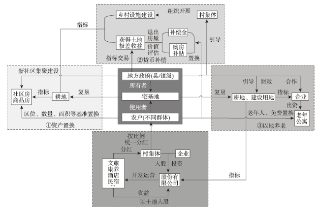 宅基地置换 | 资产置换 | 远郊村 | 居住保障 | 纯农、兼业型 | 住房需求 | 政府 | 财政资金 | 旧村改造、新社区建设 | 行政力量 | ||