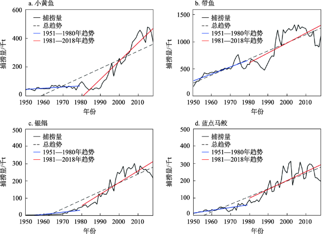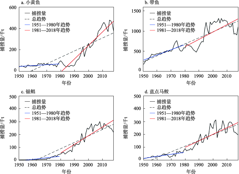 图1 1950—2018年中国近海4种经济鱼种渔获量Figure 1 Catches of four economic fishe species in China’s exclusive economic zone, 1950-2018 |