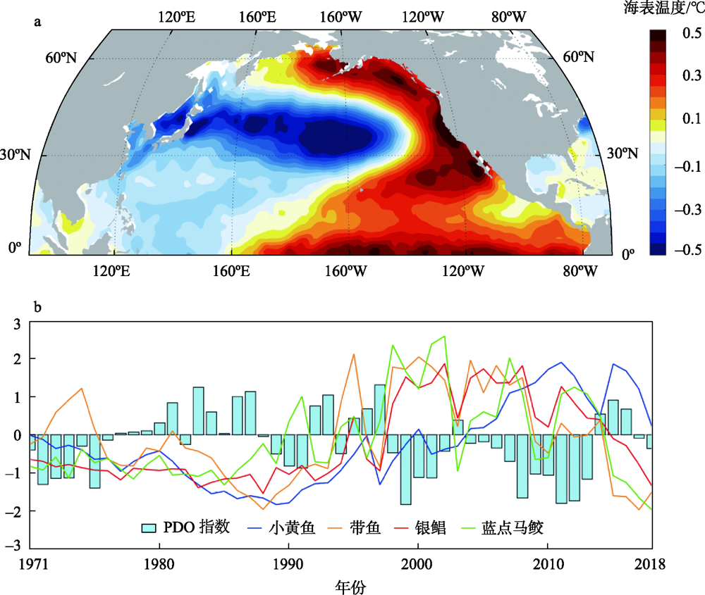 图2 1870—2018年PDO空间特征场(a)和1971—2018年PDO指数与中国近海4种经济鱼种获量变化(b)注:图b蓝色柱图表示PDO时间特征序列第一主成分PC1,4条彩色曲线表示标准化和去除线性趋势的4种渔获量变化。 Figure 2 Pacific Decadal Oscillation (PDO) pattern in 1870-2018 (a); and PDO index and catches of four economic fish species in China’s exclusive economic zone in 1971-2018 (b) |