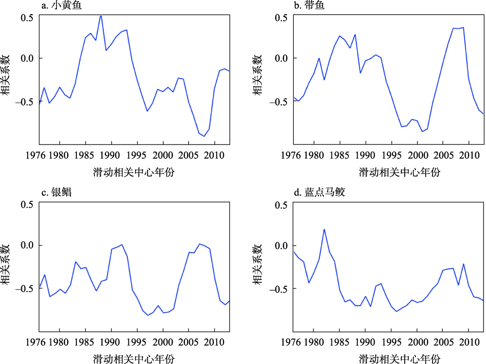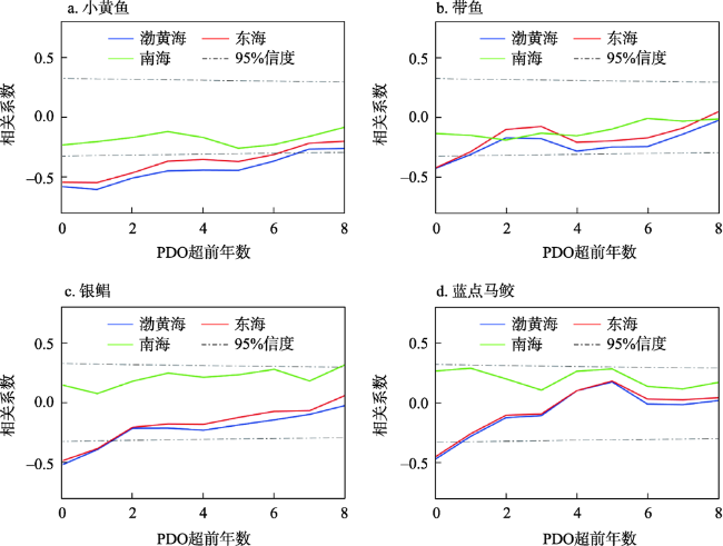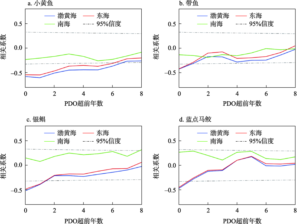 表2 1950—2018年ENSO和10年滑动平均PDO与渔获量的同期相关Table 2 Simultaneous correlation between El Nino-Southern Oscillation (ENSO) and 10-year running-mean Pacific Decadal Oscillation (PDO) and catches, 1950-2018 |
