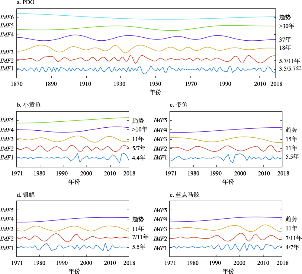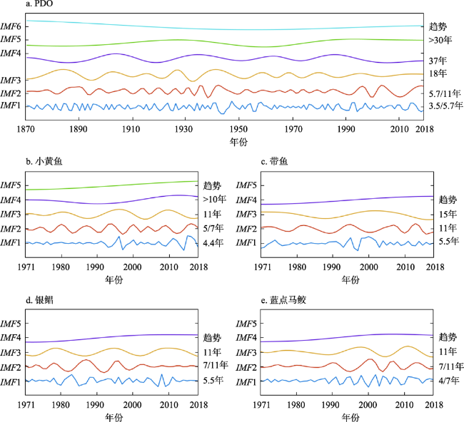图4 对1870—2018年PDO指数(a)和1971—2018年渤黄东海区渔获量(b-e)进行EMD获得的本征模态函数Figure 4 Intrinsic mode function (IMF) components of the Pacific Decadal Oscillation (PDO) index in 1870-2018 (a) and catches in the Bohai Sea, the Yellow Sea and the East China Sea in 1971-2018 (b-e) derived from empirical mode decomposition (EMD) |