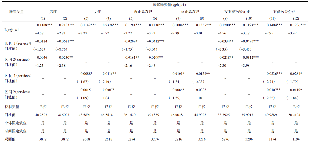 | 区间1(service≤门槛值) | -0.0384***(-5.97) | -0.0264***(-6.16) | -0.0400***(-5.75) | -0.0509***(-4.99) |