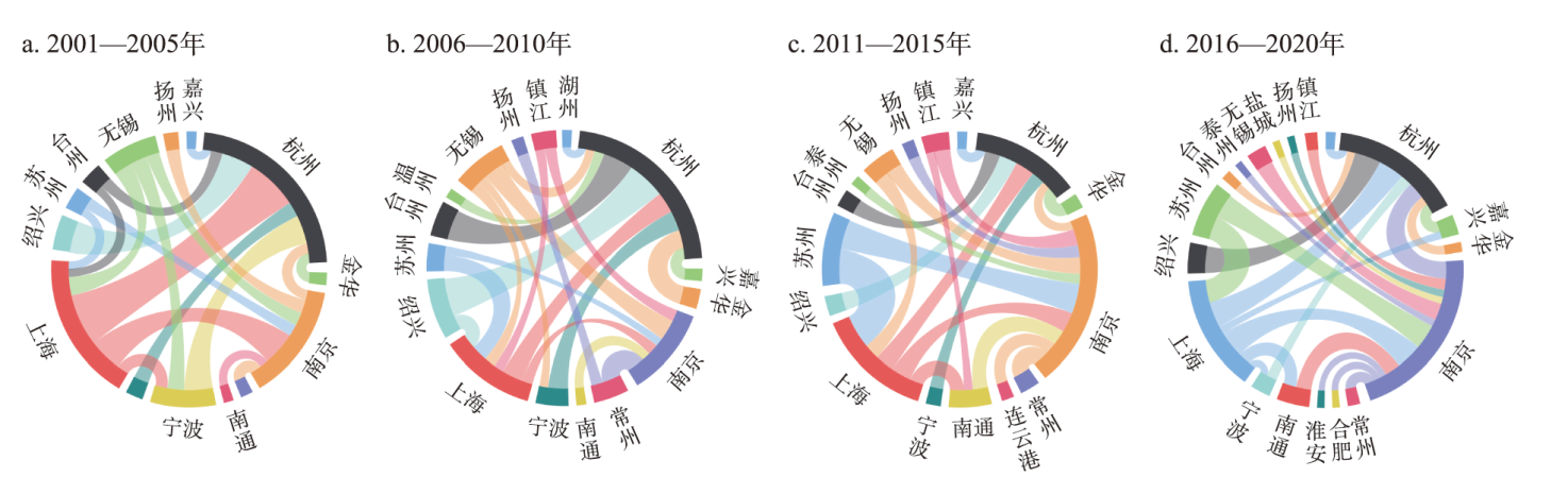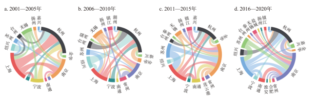 表4 2001—2020年长三角主要城市基于大学和企业的桥接中心性(a)Table 4 Bridging centrality based on universities or enterprises of the main cities in the Yangtze River Delta, 2001-2020 |