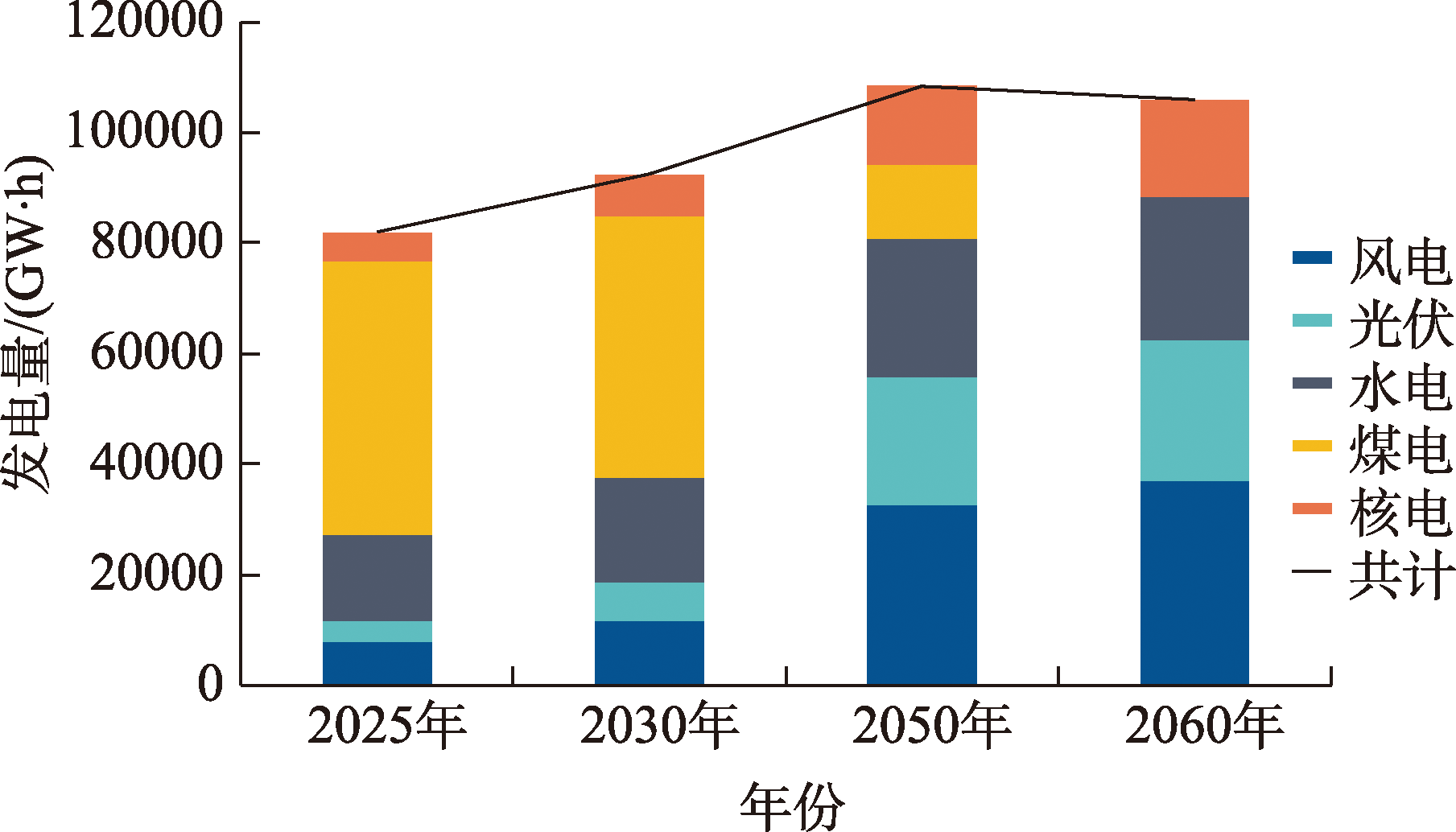 表3 2025—2060年中国能源电力系统装机容量预测 (GW)Table 3 Forecast of installed capacity of China’s energy and power system, 2025-2060 (GW) |