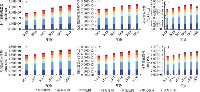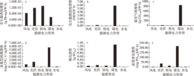 表4 2015—2020年各能源电力类型生命周期单位发电量环境影响排放Table 4 Emissions per unit of power generation in the life cycle of each energy and power type, 2015-2020 |