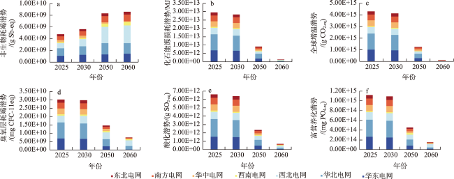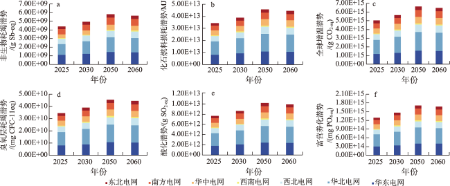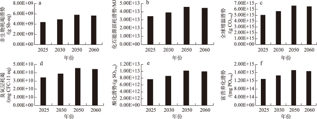 图6 2025—2060年“一切照旧”情景下中国环境影响排放的变化情况Figure 6 Changes in environmental impact emissions in China under the “business as usual” scenario, 2025-2060 |