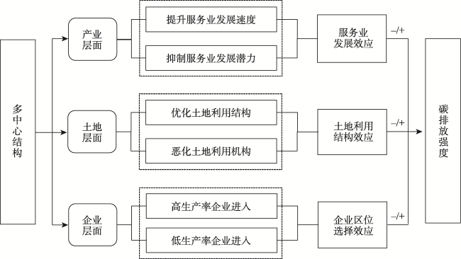 [Objective] As China transitions from mid-stage to late-stage urbanization, the polycentric structure of cities is accelerating. This study explored its impact on carbon emission intensity and the underlying mechanisms. From a spatial planning perspective, it aimed to provide new insights for low-carbon city construction. [Methods] The study examined 279 prefecture-level and above cities in China from 2006 to 2020. Using a two-way fixed effects model, instrumental variables, and propensity score matching, it empirically tested the carbon emission reduction effects of the urban polycentric structure and its underlying mechanisms. [Results] (1) From 2006 to 2020, urban carbon emission intensity showed a declining trend. Spatially, it exhibited a core-periphery structure and provincial boundary phenomena, with minor changes in the east-west gap and an increase in the north-south gap. The urban polycentric structure showed an upward trend with stable geographic clustering characteristics. (2) The polycentric structure significantly reduced carbon emission intensity, but there is regional heterogeneity. It was higher in eastern and western cities compared to central cities and higher in southern cities compared to northern cities. Additionally, it was only present in economically advanced cities and cities with a large population. (3) The mechanism analyses indicated that the urban polycentric structure reduced carbon emission intensity through three pathways: promoting faster development of the service industry, optimizing land use structure, and attracting high-productivity enterprises. However, whether enterprise location choices result in sectoral-specific or mixed clustering varied between cities. [Conclusion] In the new stage of urbanization, supporting the development of polycentric cities is necessary. However, it is crucial to understand the preconditions for the effective carbon emission reduction effects of the urban polycentric structure and to create smooth transmission channels.
