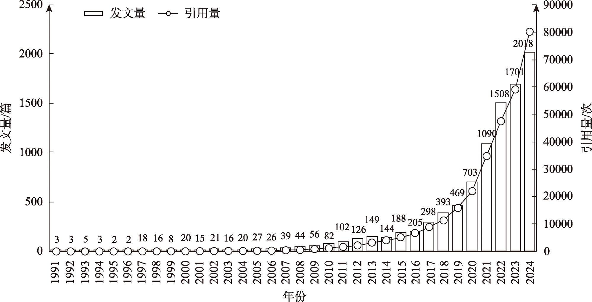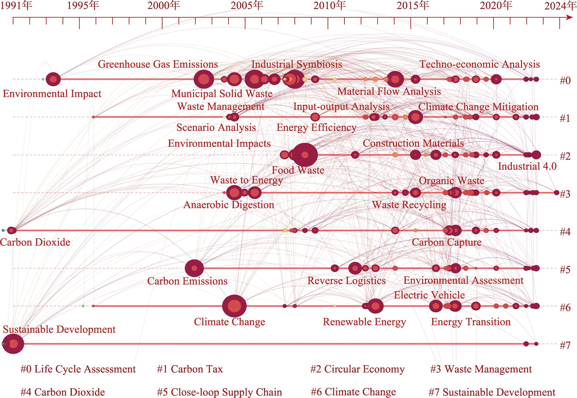 [Objective] With the intensification of climate change, countries worldwide have committed to achieving carbon neutrality to meet the temperature control targets set by the Paris Agreement. The circular economy, as a sustainable development model, is playing an increasingly prominent role in climate change mitigation. However, studies focusing on the coupling of climate change mitigation and circular economy have not yet been systematically summarized. [Methods] Based on the literature indexed in the Web of Science database, this study conducts a bibliometric analysis to summarize the research progress, current status, and hotspots in the coupling of climate change mitigation and the circular economy from 1991 to 2024, thereby providing theoretical support and practical guidance for their integration. [Results] (1) Research on the coupling of climate change mitigation and the circular economy began in 1991 and has gone through three stages: initial exploration, steady development, and rapid growth, with research content expanding from solid waste management and recycling to more industries. (2) Globally, a total of 9520 papers have been published on the coupling of climate change mitigation and circular economy, with Chinese scholars contributing the most. Chinese research institutions serve as pivotal hubs in the international collaboration network, highlighting China’s research strength and international influence in this field. (3) The research on the coupling of climate change mitigation and circular economy focuses on four key areas: climate change, circular economy, waste management, and life cycle assessment. Future research trends are expected to focus on carbon neutrality and zero-carbon goals, renewable energy scenarios, digital and intelligent technologies, and multi-method integration. [Conclusion] In the future, it is necessary to strengthen international cooperation, promote interdisciplinary exchange, and advance technological innovation, while leveraging opportunities presented by digital and intelligent development to further promote synergistic development between climate change mitigation and the circular economy.