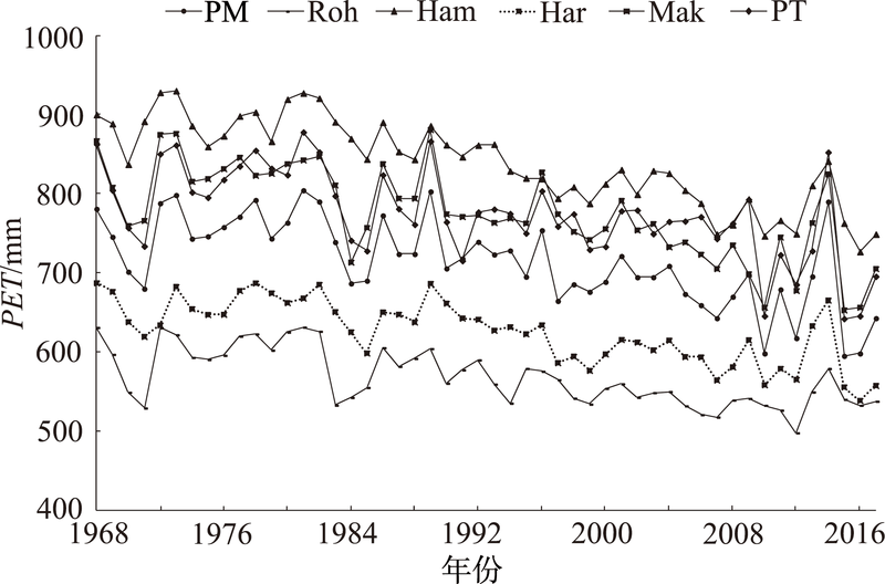 图6 修正经验系数后6种估算方法年PET变化(1968-2017) |