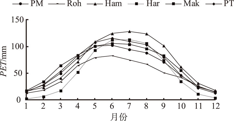 Figure 7 Results of monthly potential evapotranspiration (PET) value of the six estimation methods after the correction of the empirical coefficients |