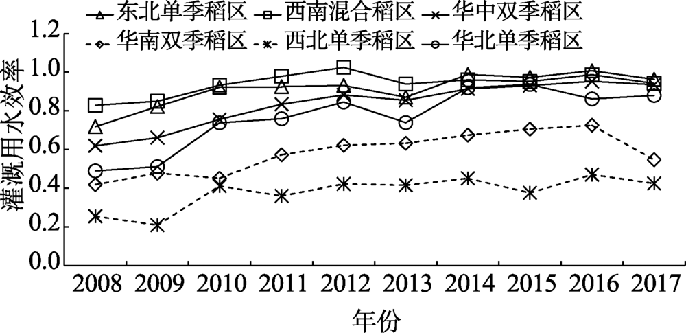 图2 2008—2017年不同稻谷种植区域灌溉用水效率 注:参照稻谷种植区划相关研究,本文中东北单季稻区包括省份为黑龙江、吉林和辽宁;西南混合稻区包括省份为四川、重庆、云南和贵州;华中双季稻区包括省份为安徽、江西、湖北、湖南、江苏和浙江;华南双季稻区包括省份为福建、广东、广西和海南;西北单季稻区包括省份为宁夏和内蒙古;华北单季稻区包括省份为河北、河南、山东和陕西。 |
