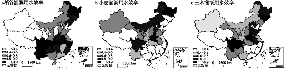 图5 全国稻谷、小麦和玉米灌溉用水效率 审图号:GS(2016)2923号 |