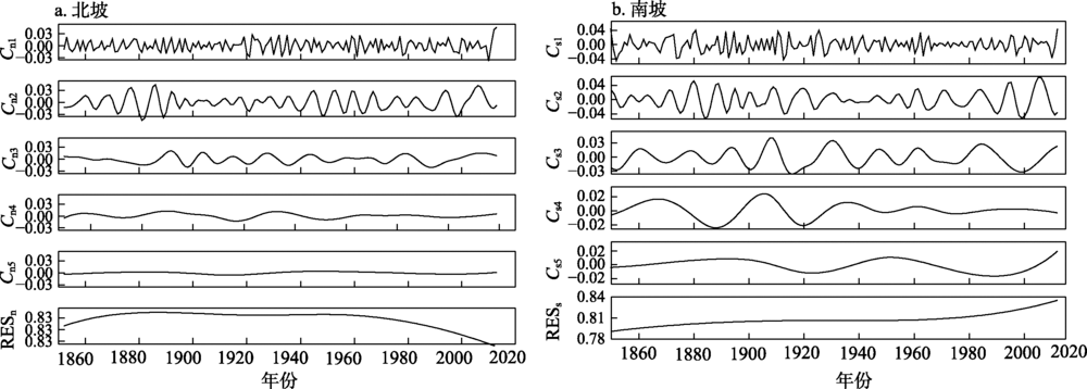 Figure 3 EEMD decomposition results of the NDVI in July sequence on the north and south slopes of Taibai Mountain from 1841 to 2013 |