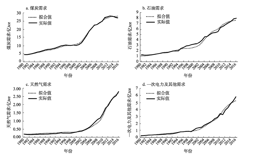 图2 1980—2016年中国主要能源需求实际值与模拟值 |