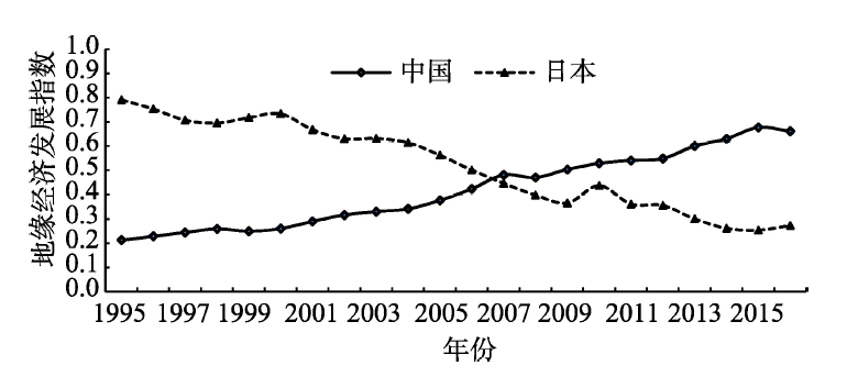 | Figure 5 Changes of geo-economics development index in China and Japan |