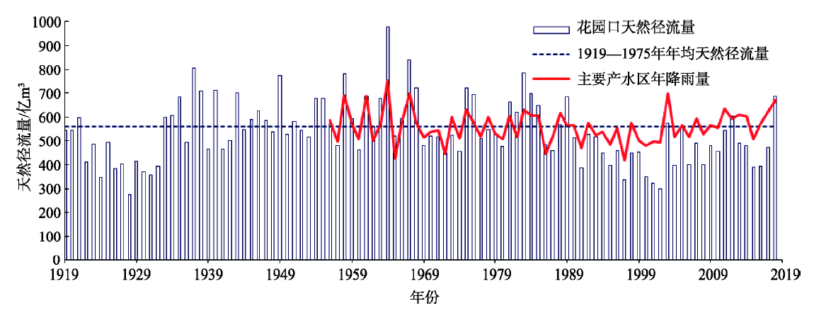 图6. 1919—2018年黄河花园口天然径流量变化注:数据来源于黄河水利委员会刘晓燕副总工程师。 |
