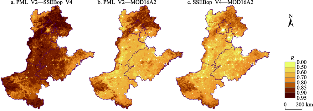 图6 2003—2018年PML_V2、MOD16A2和SSEBop_V4的ET估算值逐像元的R分布 |
