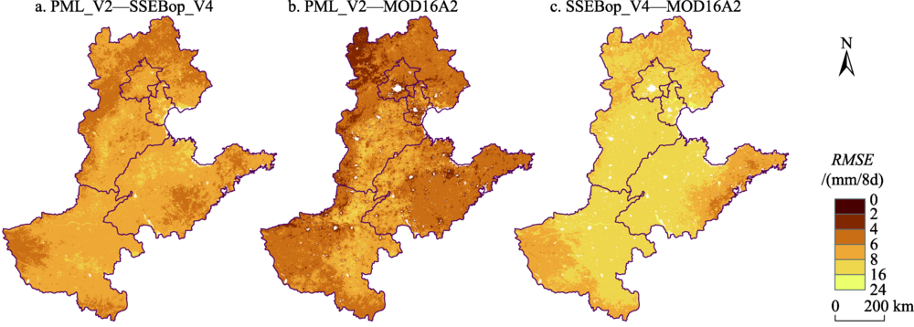 图7 2003—2018年PML_V2、MOD16A2和SSEBop_V4的ET估算值逐像元的RMSE分布 |