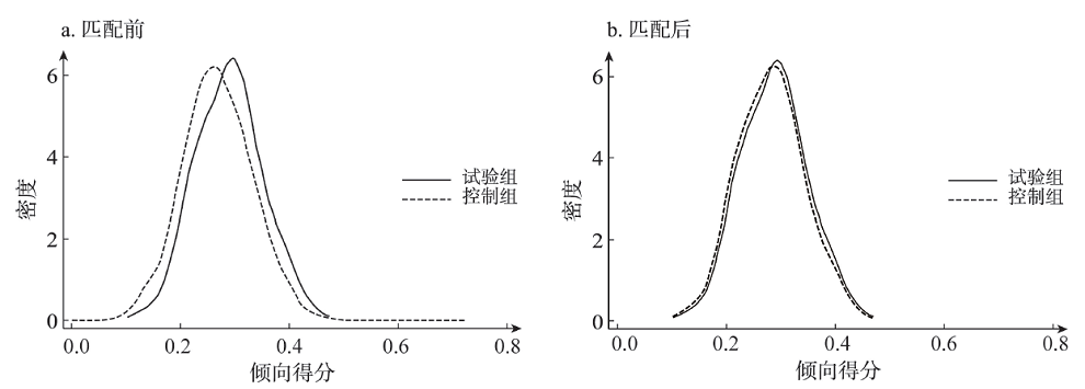 图2. 倾向得分匹配共同支撑域检验核密度函数图 |