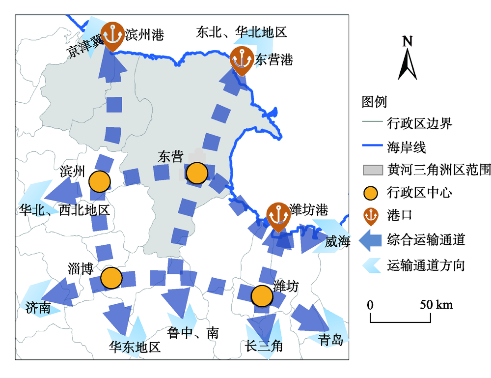 图3 黄河三角洲区相关港口及通道分布图 |