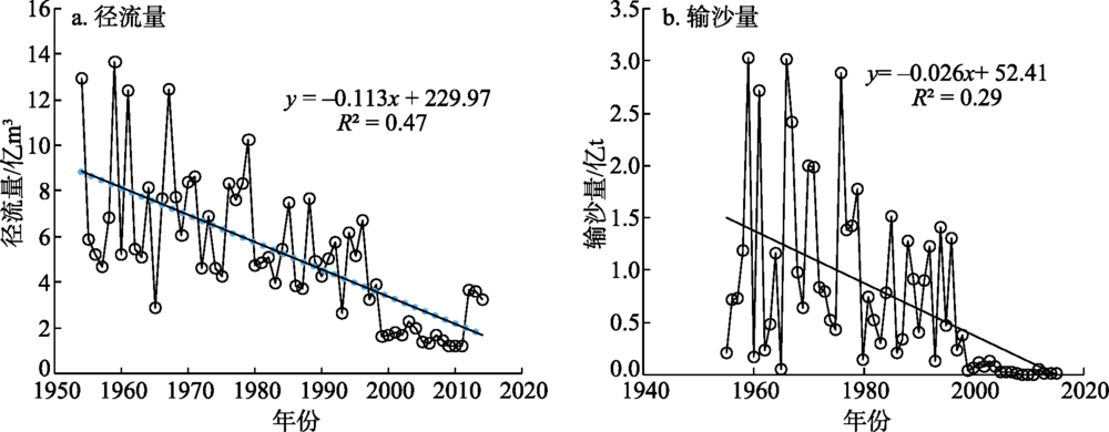 图2 1955—2015年窟野河流域年径流量和输沙量变化趋势 |