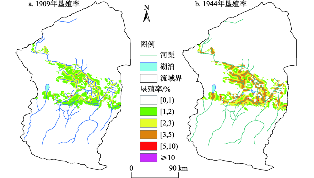 图3 1909与1944年玛纳斯河流域耕地垦殖率 |