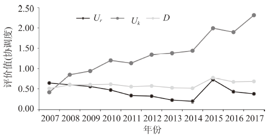 Figure 3 Comprehensive development levels of resource recycling and ecological civilization construction and their coupling and coordination degrees, 2007-2017 |