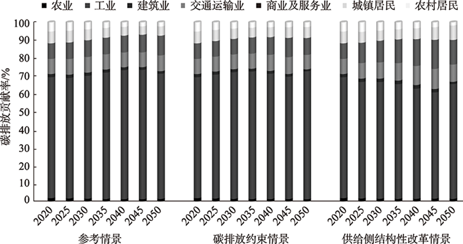 图7 不同情景下中国不同终端部门碳排放贡献率 |